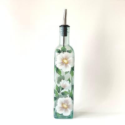 Elegant shaded white wild roses with yellow centers and deep green leaves hand-painted encircling quality 16.5 oz square bottle 10.5" tall. Perfect for oils and salad dressings, also a decorative dishwashing soap dispenser. Sealed and heat-cured for added durability. Top-rack dishwasher safe; hand-washing preferred.
