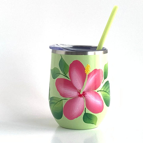 Gorgeous pink and white hibiscus flower accented with light and dark green leaves hand-painted encircling a high-quality, light green stainless steel tumbler with clear acrylic removable lid and matching straw. 20 ounce capacity; 18/8 steel, double-wall. Multiple coats of clear enamel for applied for durability.